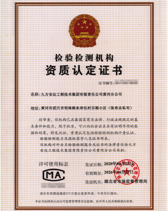 2020年4月23日,在九方安達集團大力支持下,經過黃岡和湖北分公司全體同仁的共同努力,九方安達工程技術集團有限責任公司黃岡分公司取得《檢驗檢測機構資質認定證書》。