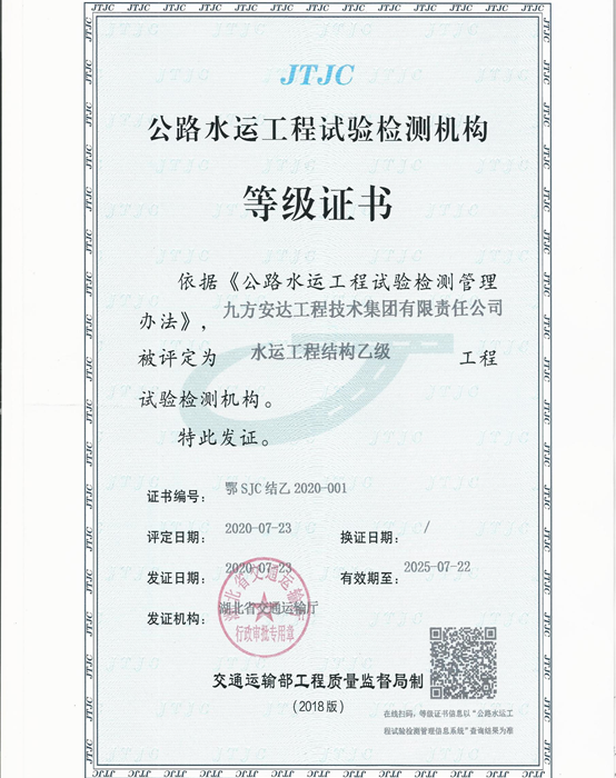 九方檢測公路水運工程試驗檢測機構等級證書