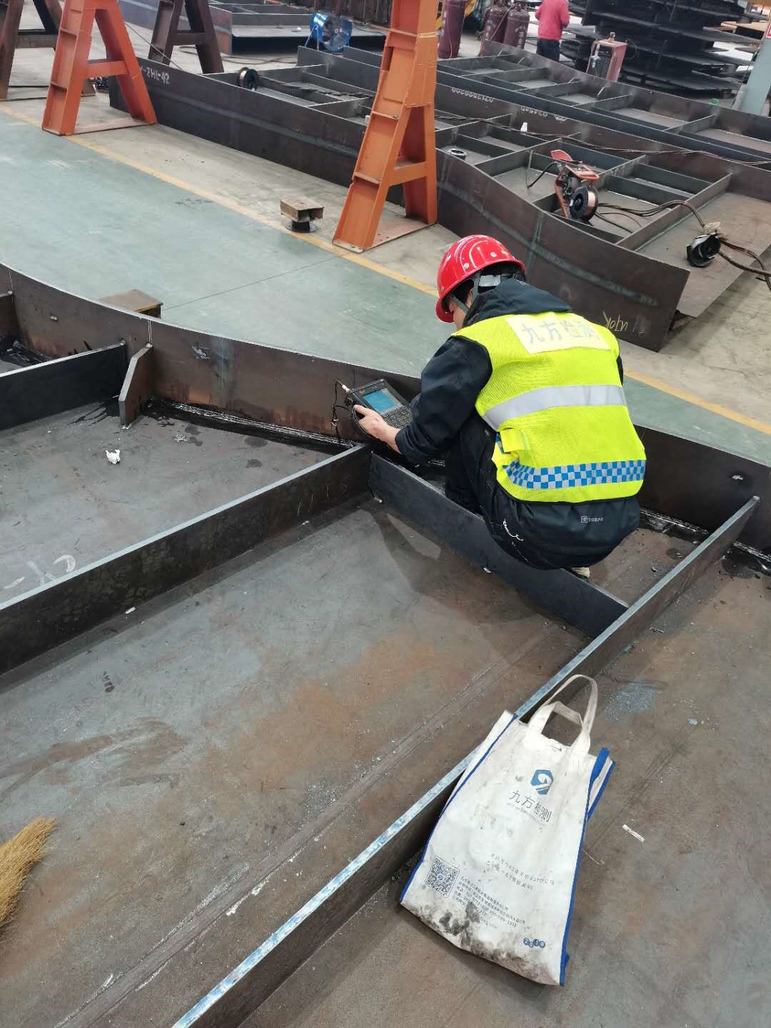 2020年6月29日,九方檢測(cè)工程師對(duì)廠內(nèi)制作焊縫開(kāi)始檢測(cè)。檢測(cè)內(nèi)容包括鋼結(jié)構(gòu)制作廠內(nèi)及現(xiàn)場(chǎng)安裝焊縫無(wú)損檢測(cè)、鋼板無(wú)損檢測(cè)、鋼材理化性能檢測(cè)、焊材理化性能檢測(cè)、涂裝質(zhì)量及其原材料檢測(cè)、緊固件檢測(cè)、焊接工藝評(píng)定。為了能更好地完成檢測(cè)任務(wù),九方檢測(cè)專門成立了創(chuàng)業(yè)大橋檢測(cè)項(xiàng)目部,人員及設(shè)備均優(yōu)先配備。