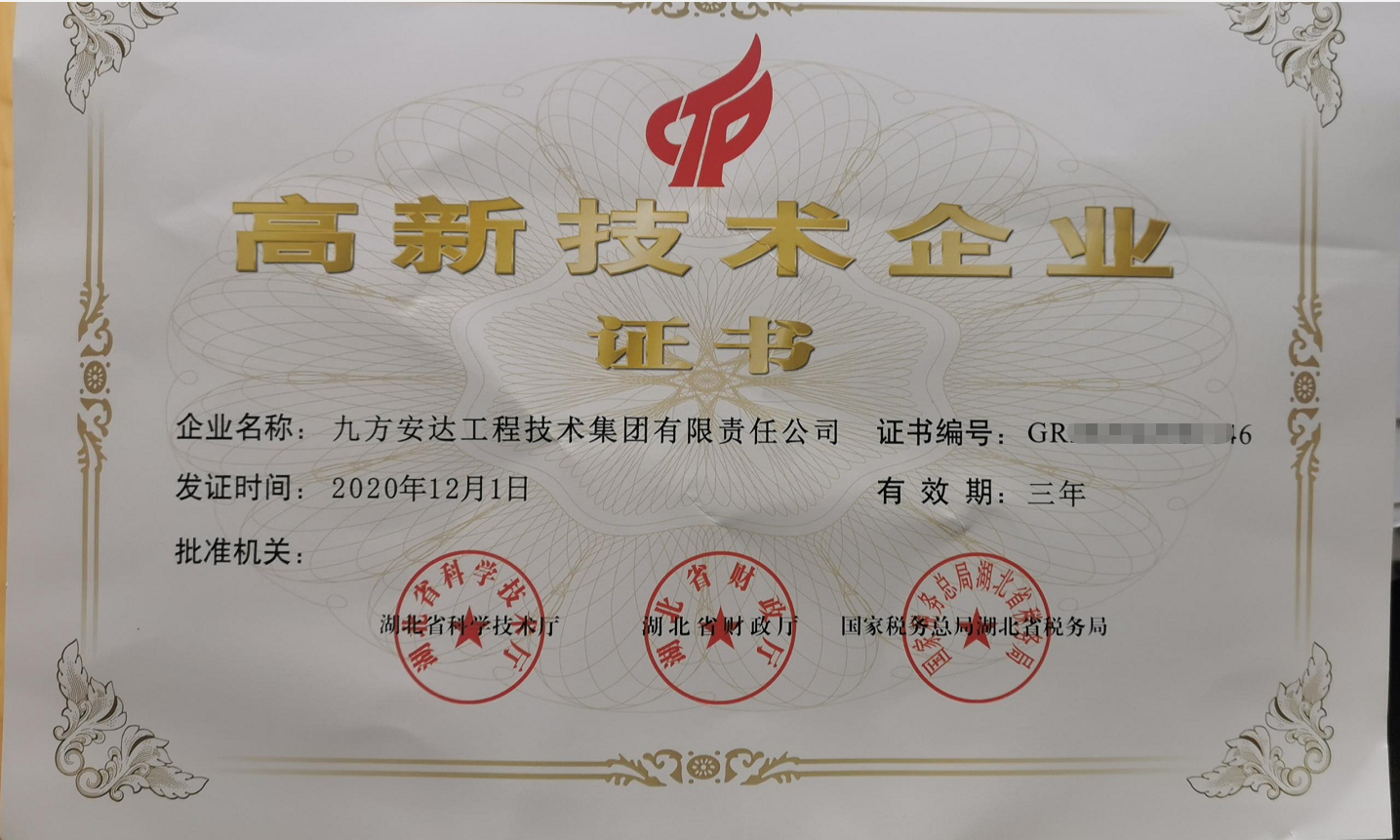 2020年12月1日,九方安達(dá)工程技術(shù)集團(tuán)有限責(zé)任公司(下稱(chēng):九方檢測(cè))被認(rèn)定為高新技術(shù)企業(yè),并由湖北省科學(xué)技術(shù)廳、湖北省財(cái)政廳、國(guó)家稅務(wù)總局湖北省稅務(wù)局聯(lián)合頒發(fā)《高新技術(shù)企業(yè)證書(shū)》,正式邁入了高新技術(shù)企業(yè)的行列。