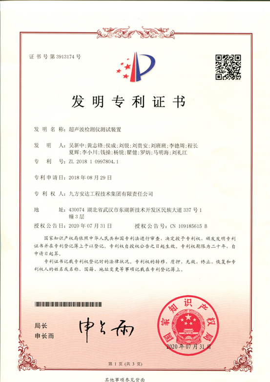 九方檢測(cè)超聲波檢測(cè)儀測(cè)試裝置專(zhuān)利證書(shū)
