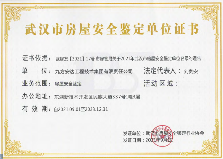 2021年9月1日。根據(jù)市住房保障房管局關(guān)于2021年武漢市房屋安全鑒定單位名錄的通告,九方安達(dá)工程技術(shù)集團(tuán)有限責(zé)任公司(簡稱九方檢測)順利取得由武漢市房屋安全鑒定協(xié)會頒發(fā)的武漢市房屋安全鑒定單位證書,至此九方檢測房屋安全鑒定單位證書已延續(xù)至2023年12月31日。