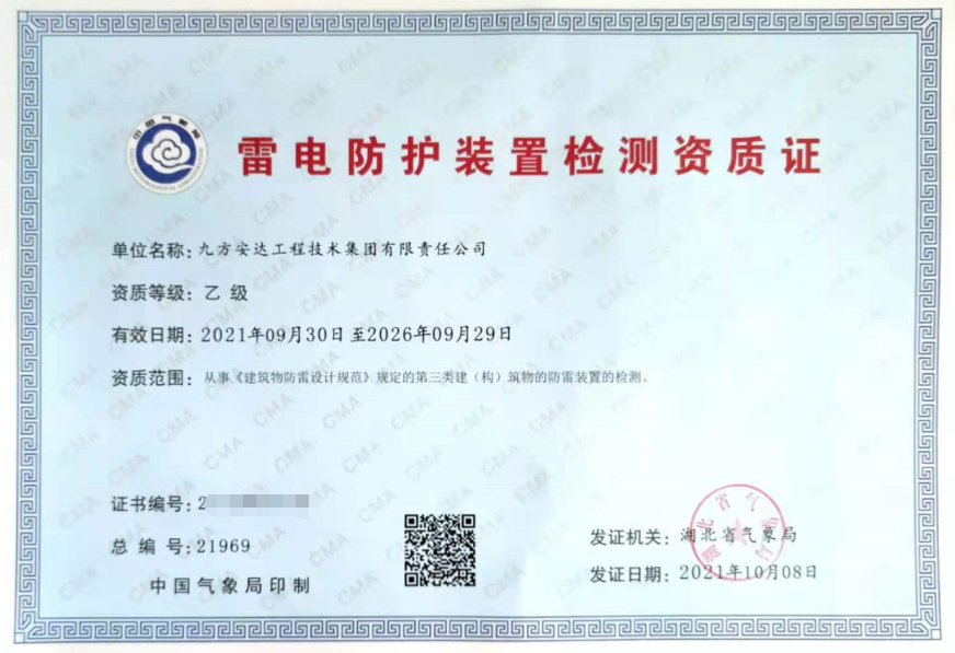 2021年10月8日,九方安達工程技術(shù)集團有限責(zé)任公司(下稱:九方檢測)取得了由湖北省氣象局頒發(fā)的雷電防護裝置檢測資質(zhì)證書。