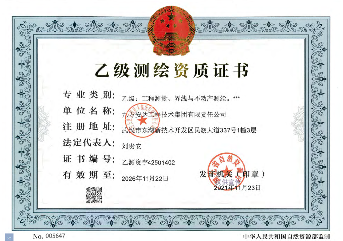 2021年11月23日,九方安達(dá)工程技術(shù)集團(tuán)有限責(zé)任公司已取得乙級(jí)測(cè)繪資質(zhì)證書,即我司測(cè)繪資質(zhì)已順利升級(jí)至乙級(jí),并延續(xù)至2026年11月22日。