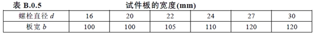 試件鋼板的厚度 t1、t2 應(yīng)根據(jù)鋼結(jié)構(gòu)工程中有代表性的板材厚度來確定,同時(shí)應(yīng)考慮在摩擦面滑移之前,試件鋼板的凈截面始終處于彈性狀態(tài);寬度 b 可參照下圖 表B.0.5 規(guī)定取值。L1應(yīng)根據(jù)試驗(yàn)機(jī)夾具的要求確定。