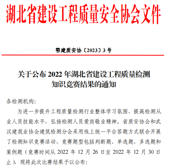 為提升工程質(zhì)量檢測行業(yè)整體學(xué)習(xí)氛圍,提高從業(yè)人員技能,弘揚檢測人員愛崗敬業(yè)精神,九方安達(dá)工程技術(shù)集團(tuán)有限責(zé)任公司(以下簡稱“九方檢測”)參加了省質(zhì)安協(xié)會和武漢建筑業(yè)協(xié)會建筑檢測分會聯(lián)合組織的檢測知識競賽,該活動采用線上平臺答題方式,九方檢測七名檢測工程師從數(shù)千人中脫穎而出,在多個專項中獲獎,體現(xiàn)我司技術(shù)實力。