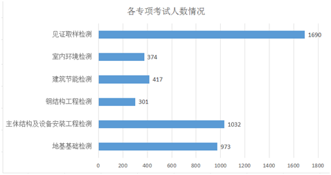 各專項考試人次分別為:地基基礎(chǔ)工程檢測專項973人,主體結(jié)構(gòu)及設(shè)備安裝工程檢測專項1032人,鋼結(jié)構(gòu)工程檢測專項301人,建筑節(jié)能檢測專項417人,室內(nèi)環(huán)境檢測專項374人,見證取樣檢測專項1690人,累計考試人次為:4787人次。詳見圖2。